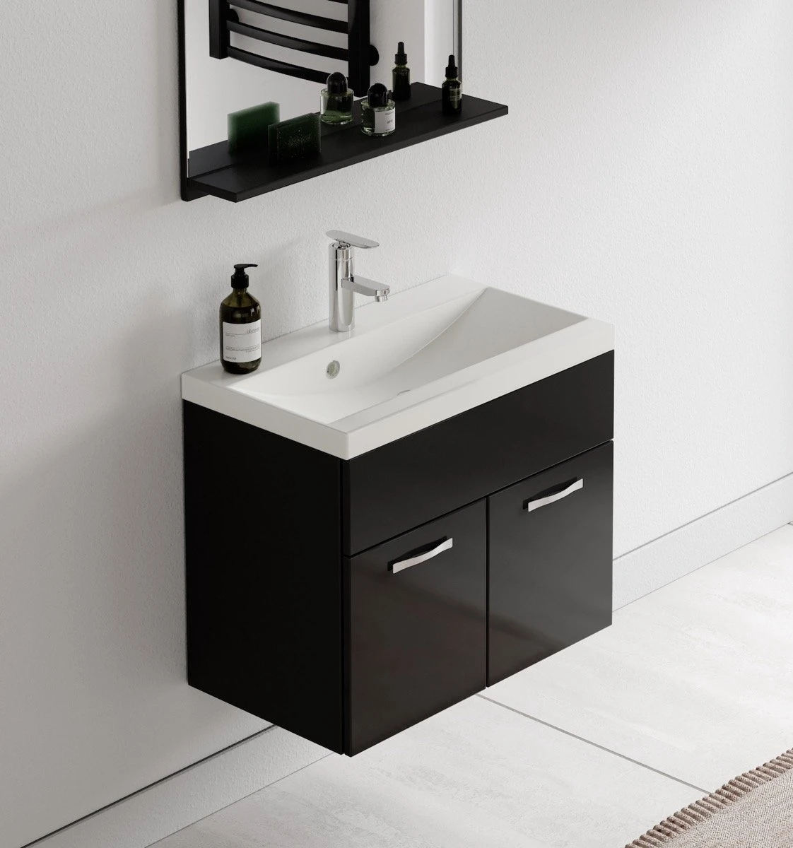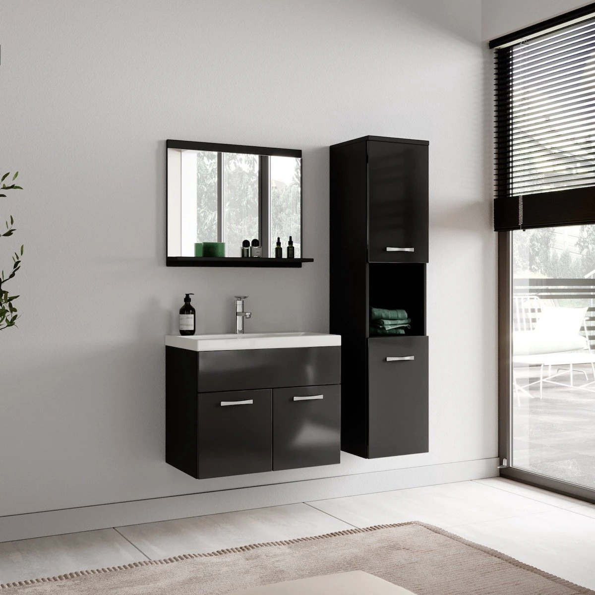 Badkamermeubel set Montreal inclusief wastafel, spiegel en kolomkast. Deze set is bedoeld om iedere badkamer, groot of klein, van extra bergruimte te voorzien en een moderne en luxe uitstraling te geven.