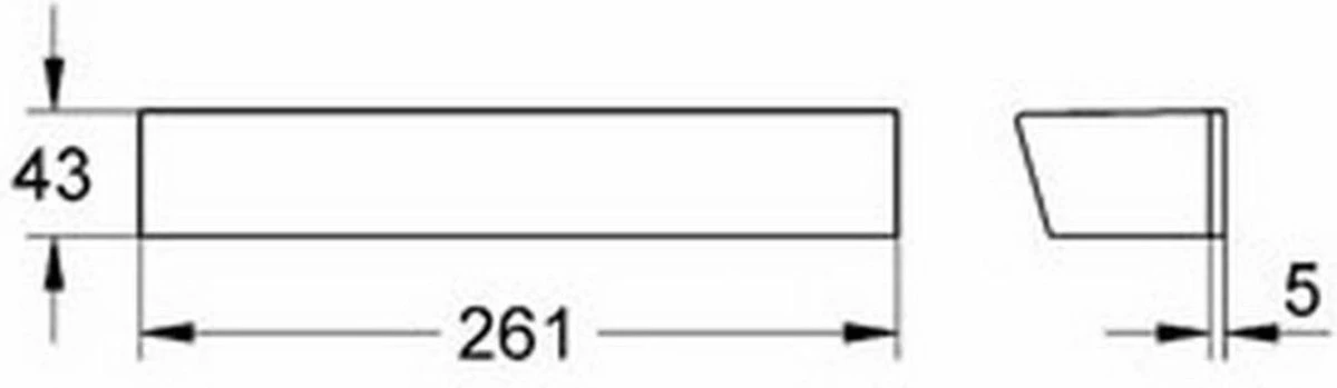 Materiaal planchet Overig Lengte 261.000000mm Kleur planchet Overig Diepte 43.000000mm Hoekuitvoering N Hoogte 5.000000mm Met bevestigingsmateriaal J Met glashouder N Met losse glasplaat N Met rol/gastendoekhouder N Met tandenborstelhouder N Met verwisselbare decor-afdekkap/rozet N Met zeeppomp N Oppervlaktebescherming Verchroomd Profiel raamwerk Geen Uitvoering planchet Overig Veiligheidsglas N Verdekte bevestiging J