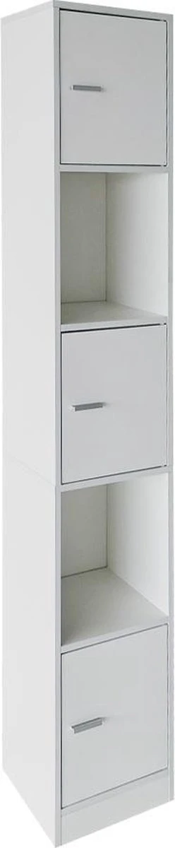 Deze witte universele kast voor op de badkamer de slaapkamer in de hal of gang met een witte ombouw en witte deuren is geschikt voor elke badkamer of andere ruimte in uw woning. Deze kolomkast vakkenkast heeft 3 vakken met deuren met daarachter opbergruimte voor items die u niet in het zicht wilt hebben liggen.Twee open opbergvakken voor het opbergen van handdoeken badkamer accessoires of andere items. Dit badkamer meubel is ruimtebesparend en biedt ook nog eens voldoende opbergmogelijkeden zodat uw badkamer ordelijk blijft. Kleur: wit met witte deuren. Afmetingen: hoog 180 cm breed 33 cm diep 30 cm. Levering is inclusief handleiding en benodigde montagematerialen.