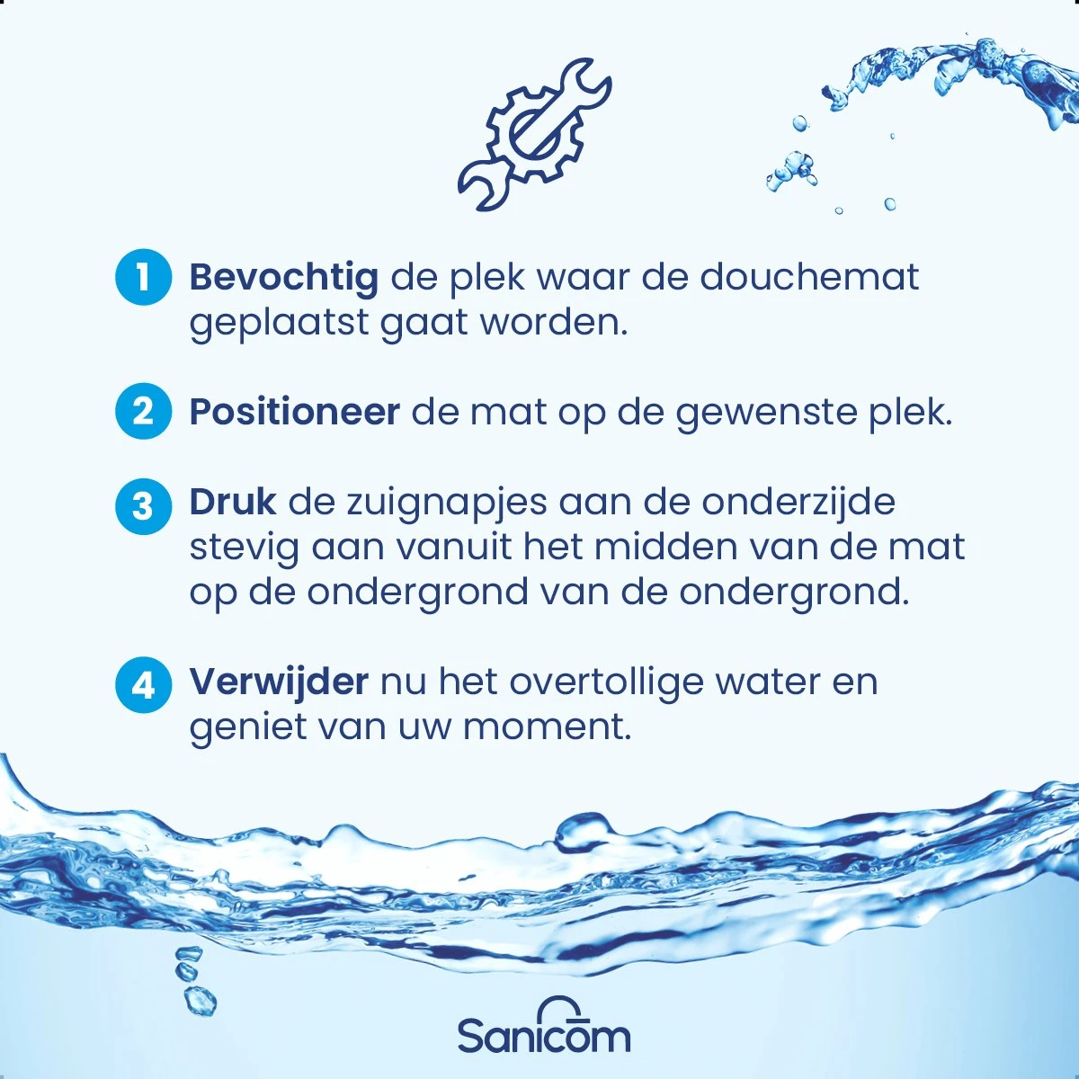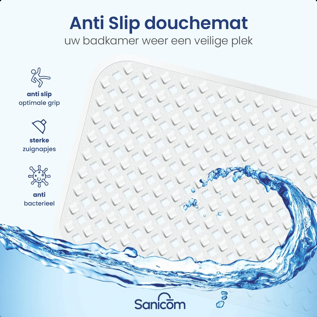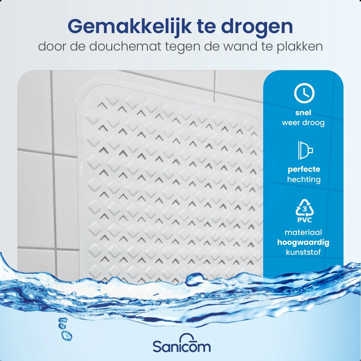 Een stevige antislipmat zorgt ervoor dat jouw badkamer en douche weer een veilige plek worden. De antislip douche- en badmatten van Sanicom beschikken over veel en sterke zuignappen zodat de mat extra grip heeft. Daarnaast kan door het slimme ontwerp gemakkelijk al het water weglopen, zo voorkom je extra vochtigheid en schimmelvorming. Zo blijft jouw badkamer veilig en schoon.