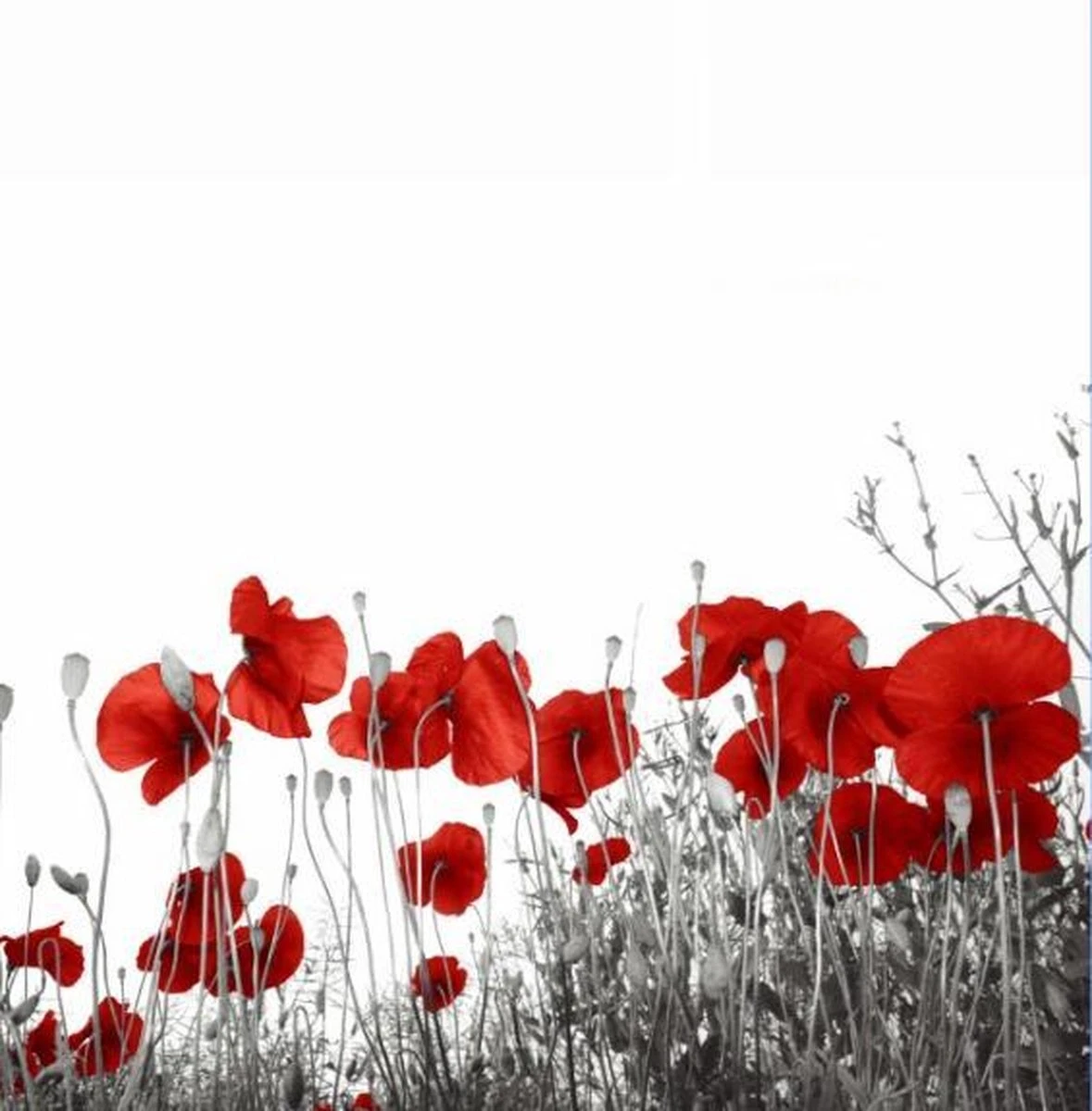 Het gordijn is mooi helder wit met daarop de fotoprint met het rood van de klaprozen.