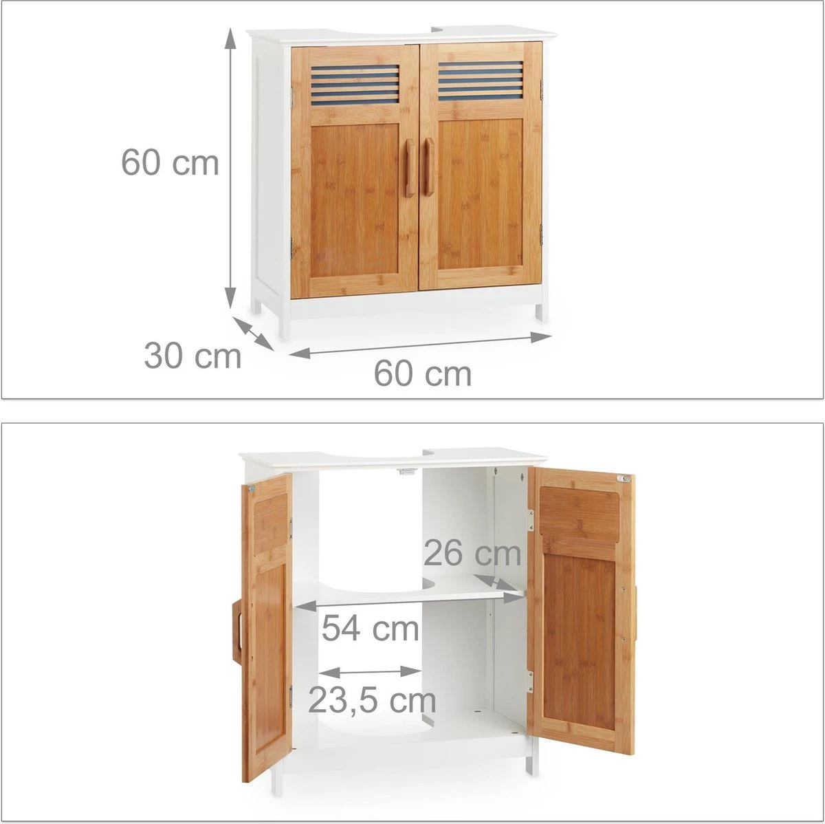 Je bent opzoek naar een mooie onderkast voor in de badkamer? Deze witte wastafelonderkast is precies wat je nodig hebt, om diverse voorwerpen op een elegante manier in de badkamer op te bergen. Het lamellen design van de bamboe deuren met natuurlijke houtnerf is een echte blikvanger. De magnetische sluiting voorkomt dat de deuren vanzelf open gaan. De sifon uitsparing maakt het mogelijk de badkamerkast onder alle wastafels te plaatsen. De planken kunnen op 3 verschillende hoogtes geplaatst worden.