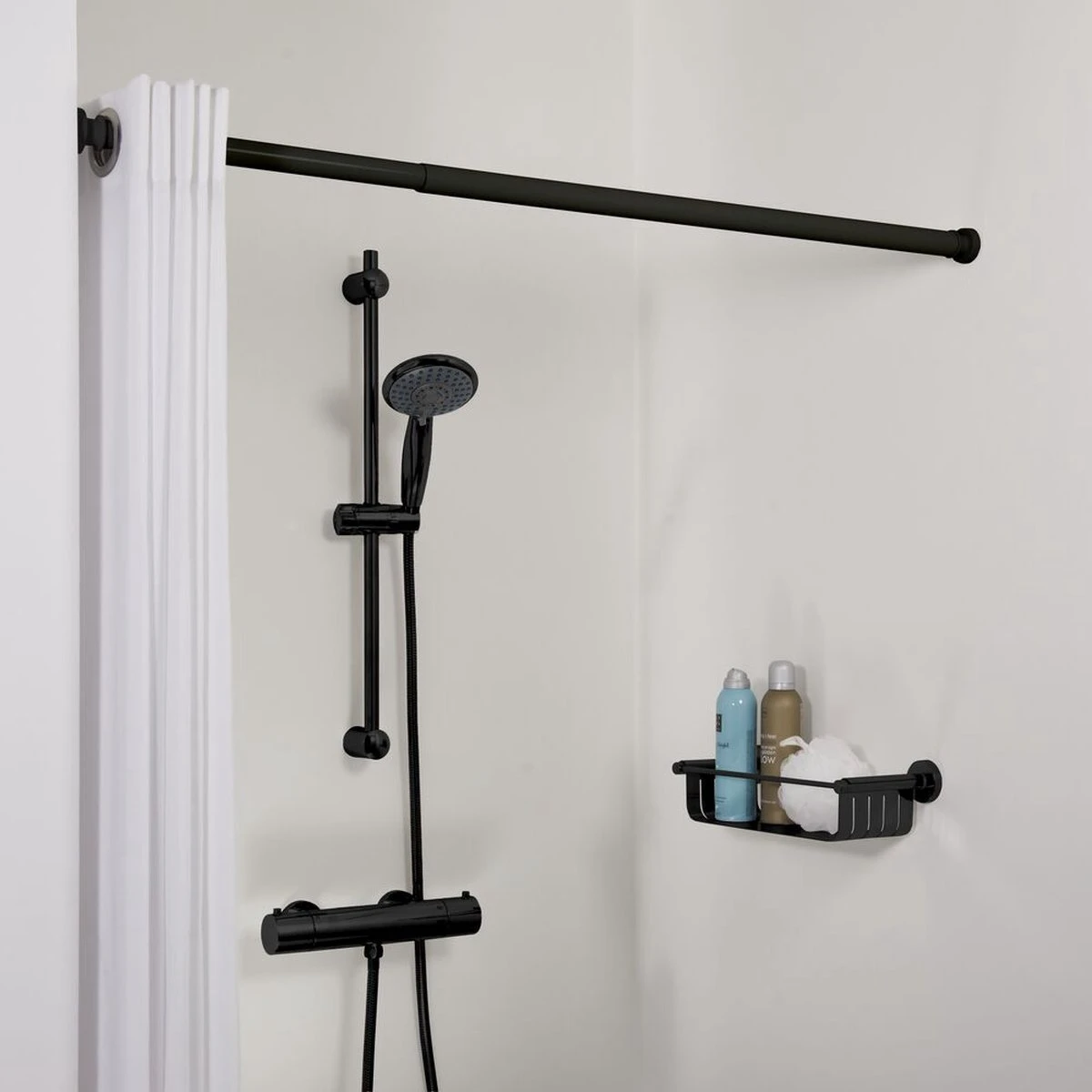 Boren niet jouw ding? De Sealskin douchegordijnstang klem je snel en eenvoudig tussen jouw douchewanden. Dankzij de verstelbaarheid past hij in ruimtes van 80 cm tot maximaal 130 cm. Daarnaast heeft de stang een doorsnede van 28 mm en is daarmee geschikt voor vrijwel alle soorten douchegordijnringen. De Seallux-stang hangt stevig op zijn plek, is gemaakt van aluminium en uitgevoerd in de kleur zwart.