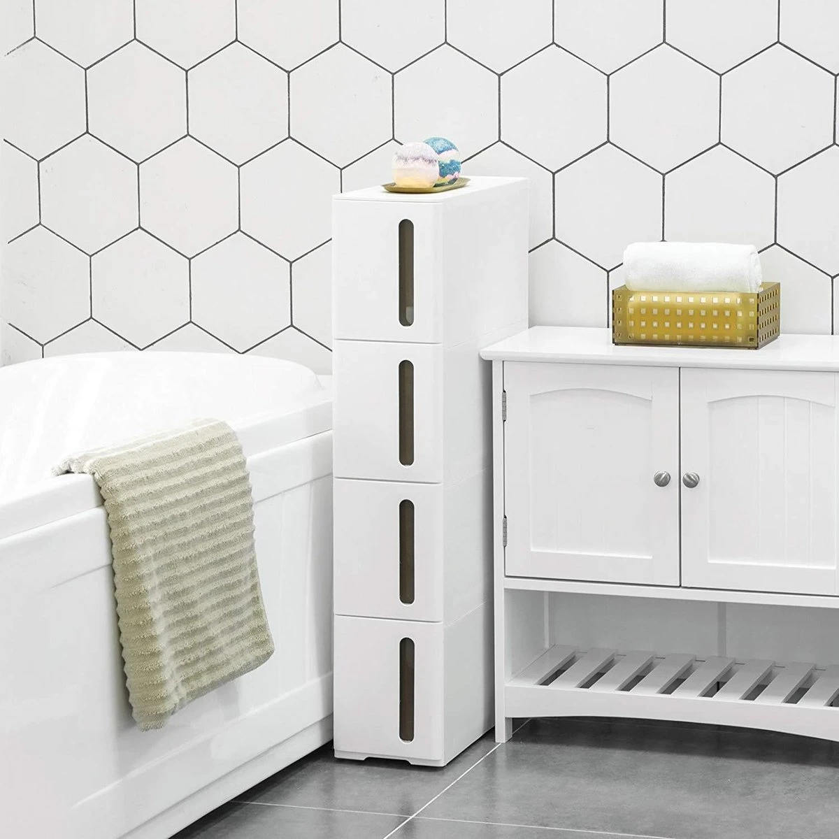 Dit badkamer kastje met een afmeting van 45 x 17 x 84 cm is perfect om tussen smalle openingen te passen en creëert opslagruimte waarvan je nooit wist dat die bestond.