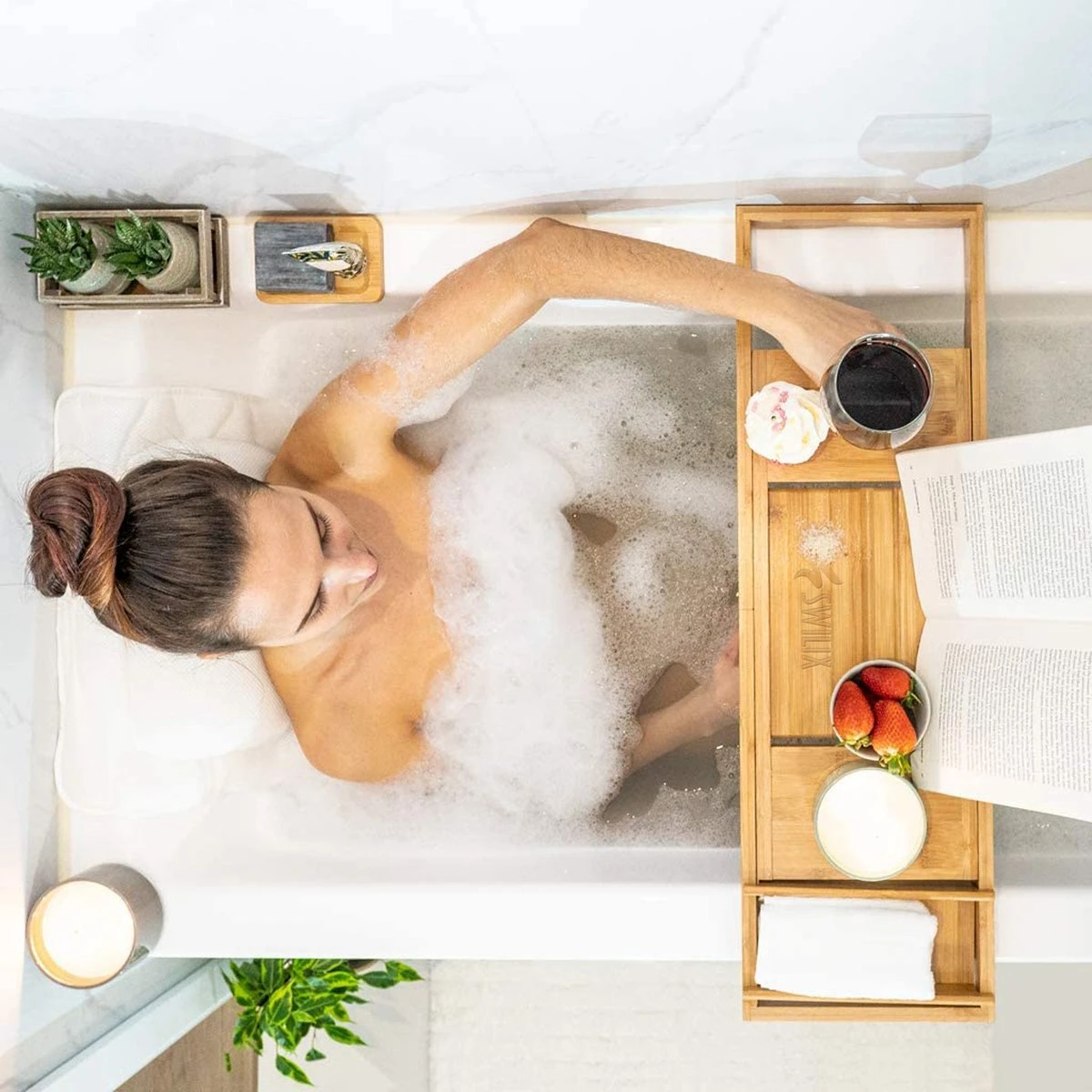 Het Swilix bamboe badrek zorgt voor de ultieme ontspanning in bad. Beker thee of wijnglas zijn gemakkelijk te plaatsen in de daarvoor ontworpen houders. In de verstelbare boekenhouder is favoriet leesvoer of een tablet te plaatsen. Daarnaast is er voldoende ruimte om andere favoriete spullen mee te nemen in bad, zoals telefoon, cosmetica, spons of badhanddoek.