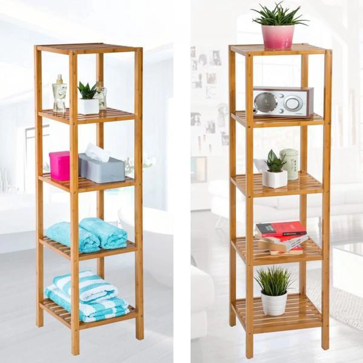 Dit prachtige staande rek overtuigt door zijn moderne uiterlijk alsmede door zijn kwaliteit. Het rek is gemaakt van gelakt bamboe en biedt via zijn opbergvakken veel ruimte voor boeken, speelgoed en veel andere gebruiksvoorwerpen in elke denkbare ruimte in het huis. Vooral in de badkamer is het staande rek als handdoekrek op zijn plaats.