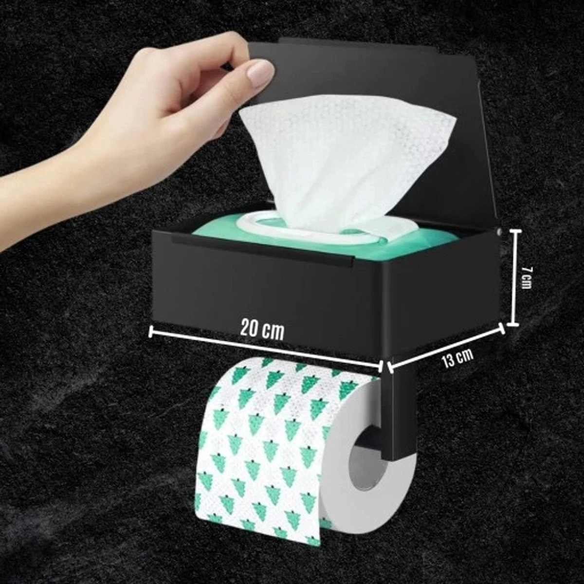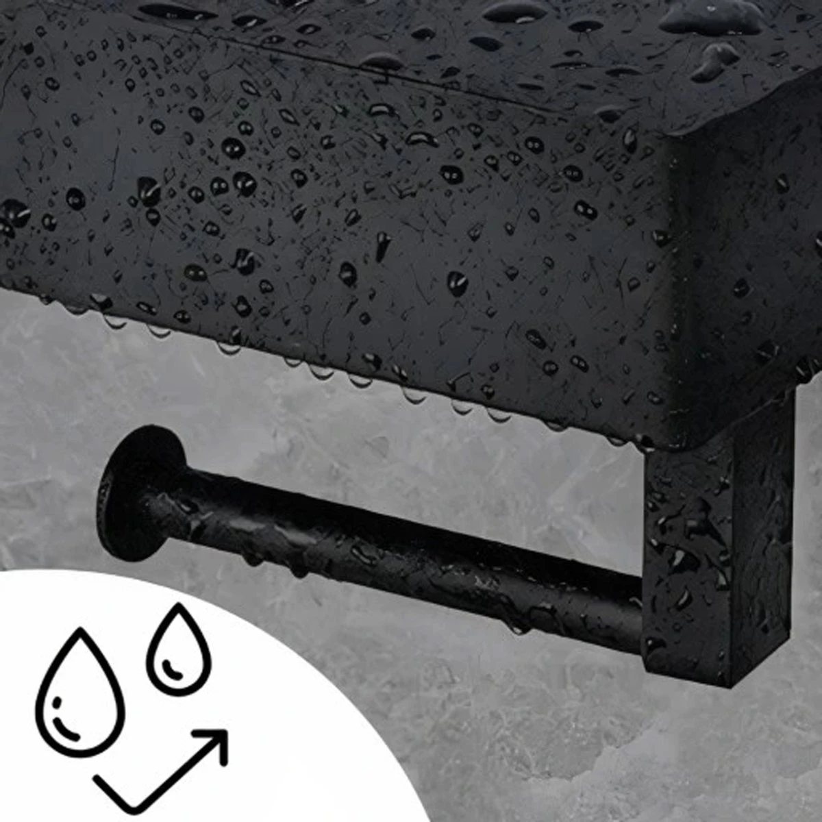 Een open toiletrolhouder met een vak voor tissues en andere badkameraccessoires. Het zorgt ervoor dat de noodzakelijke dingen altijd binnen handbereik zijn. Het neemt niet veel ruimte in beslag en combineert twee functies. Gemaakt van zwart gepoedercoat roestvrij staal. Montage met meegeleverde schroeven en pluggen of zelfklevend.