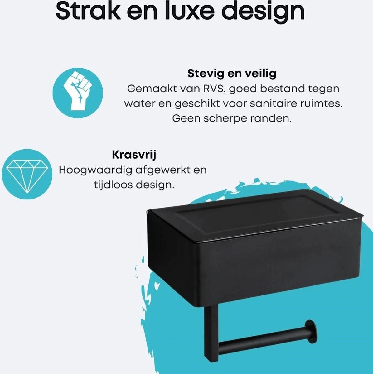 Gemaakt van RVS en goed bestand tegen water waardoor de toiletrolhouder geschikt is voor sanitaire ruimtes. Industriele stijl, strak en luxe design, hoogwaardig afgewerkt en geen scherpe randen.