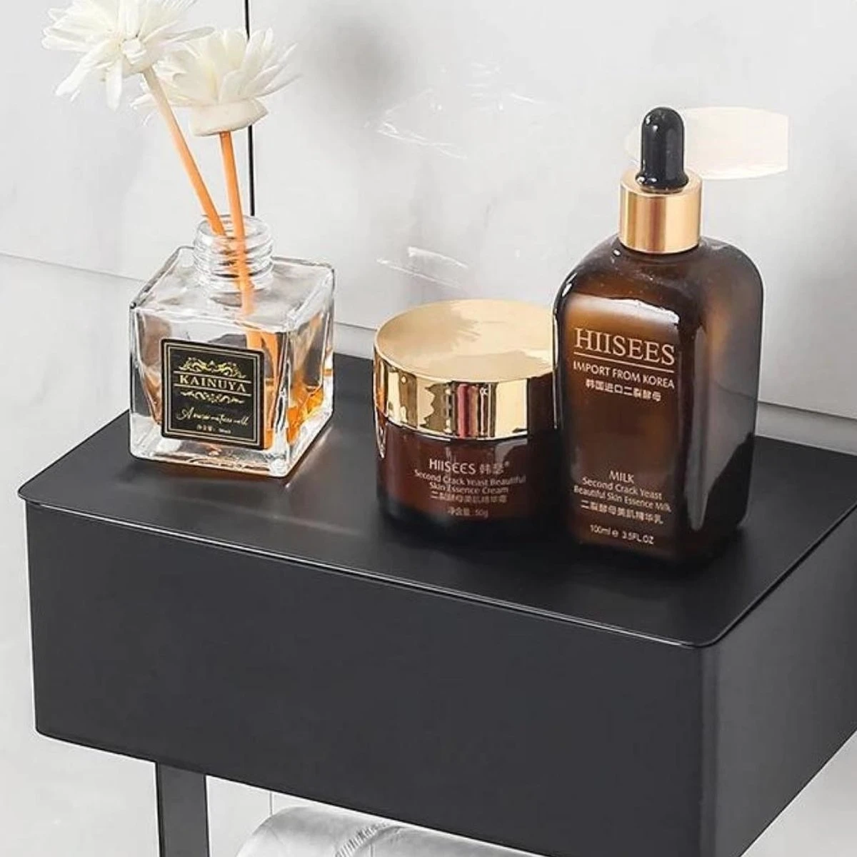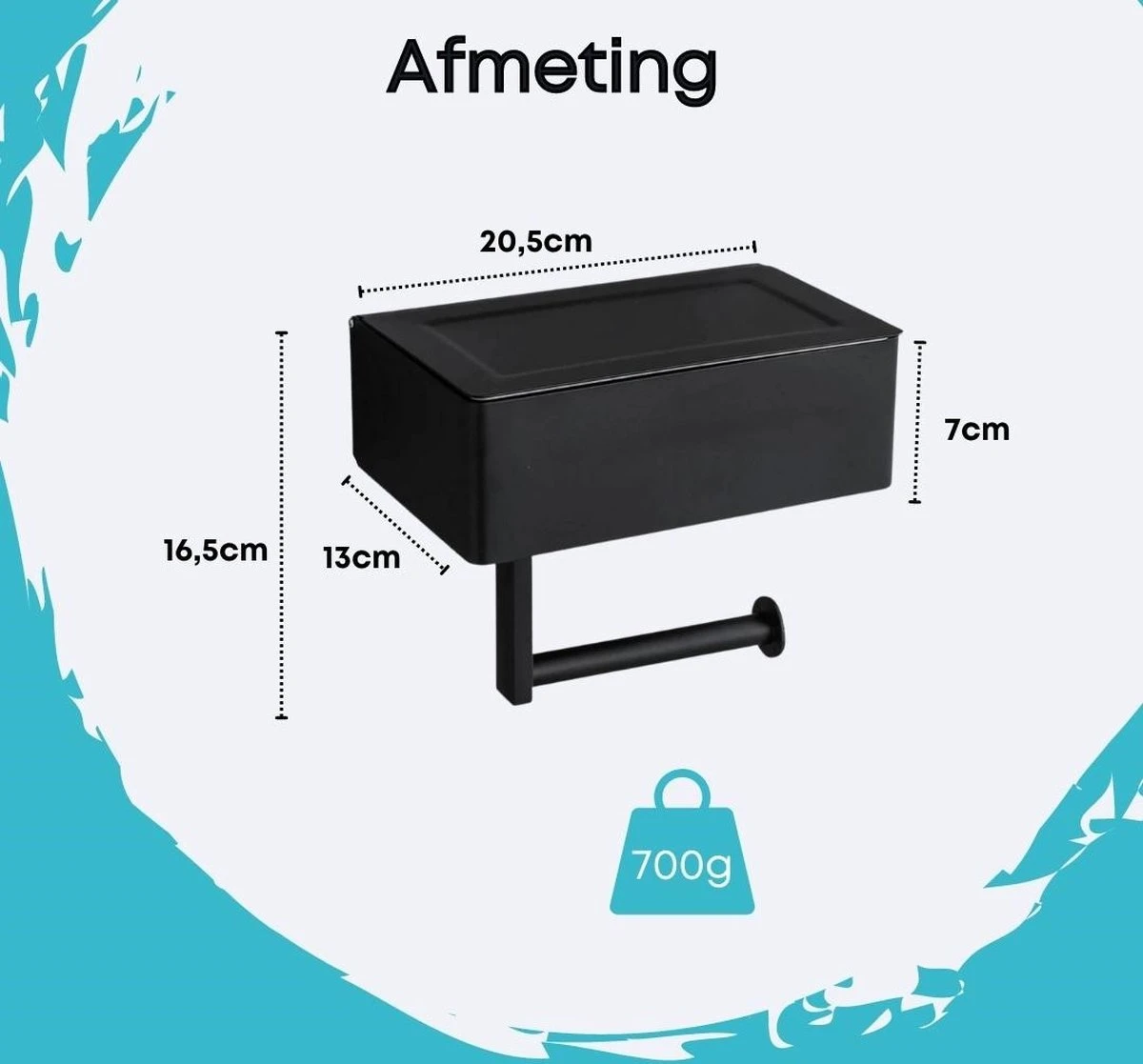 Toiletrolhouder met plankje en bakje voor uw toiletaccessoires.